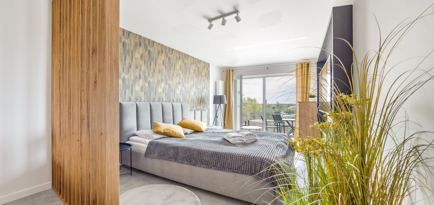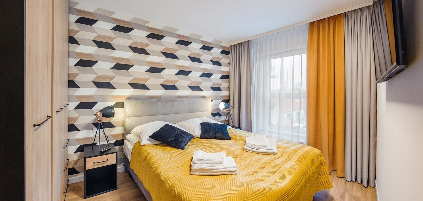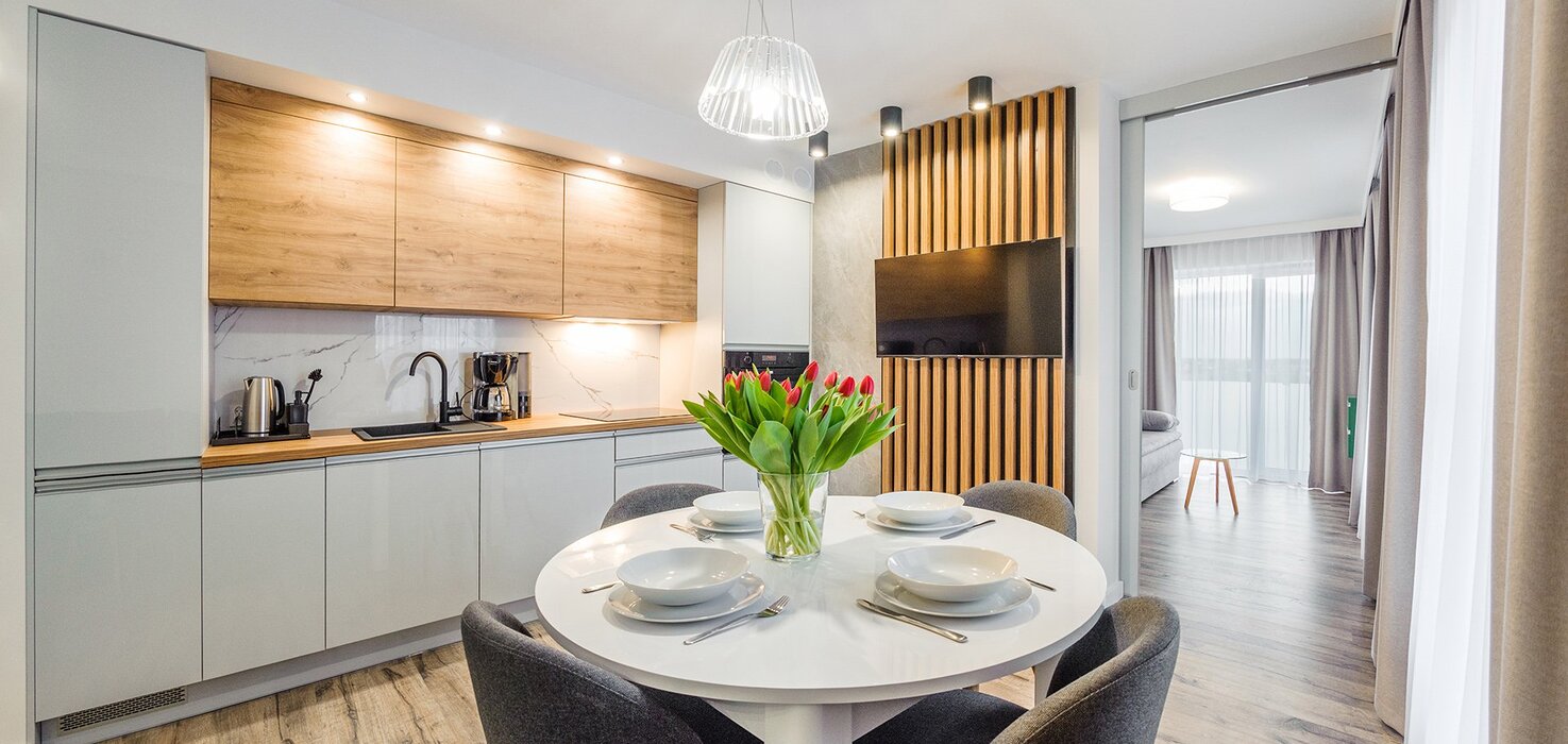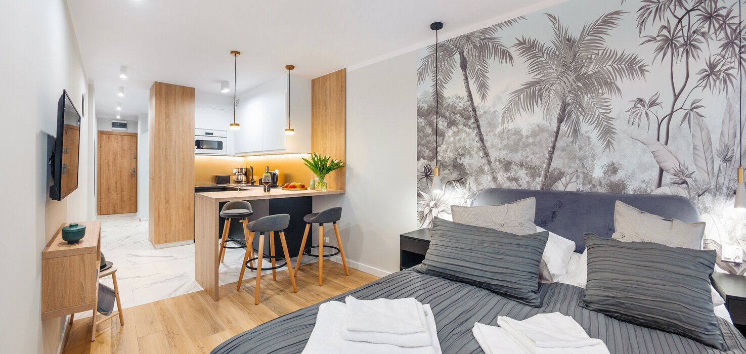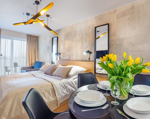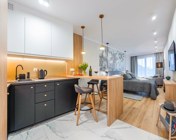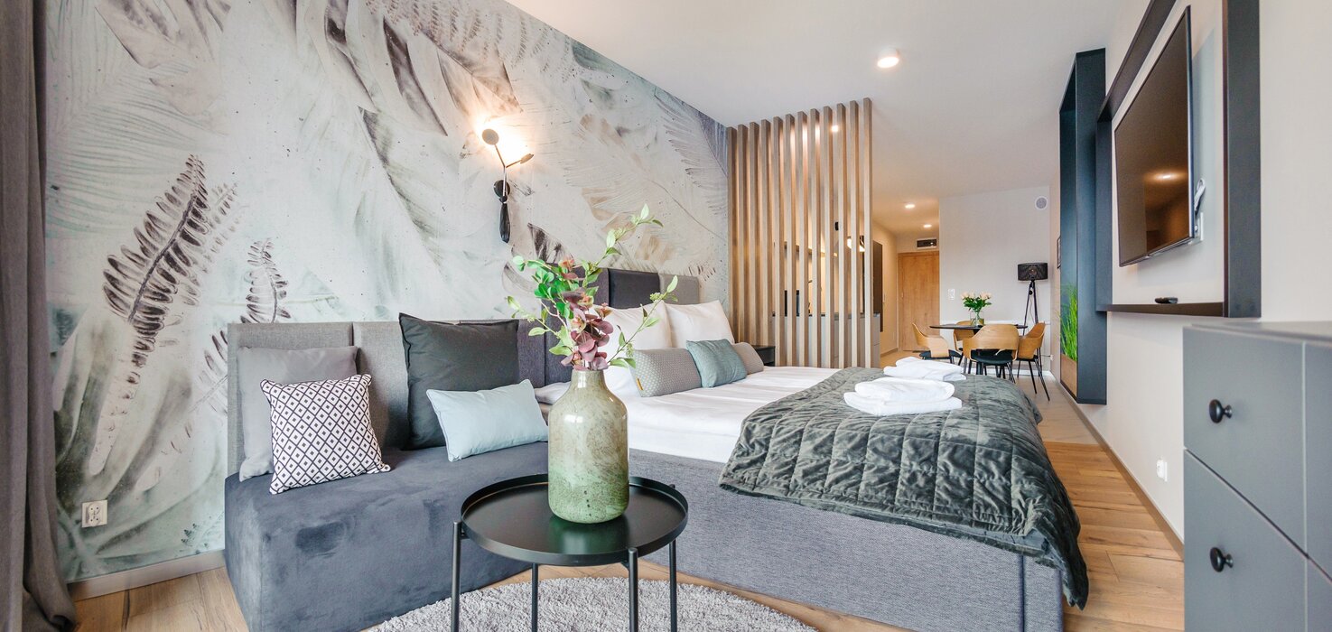 Alle Apartments sind hochwertig ausgestattet, individuell in warmen Farbtönen gestaltet, verfügen über funktionale, komplett ausgestattete Küchenzeilen sowie einen Balkon oder eine Terrasse.